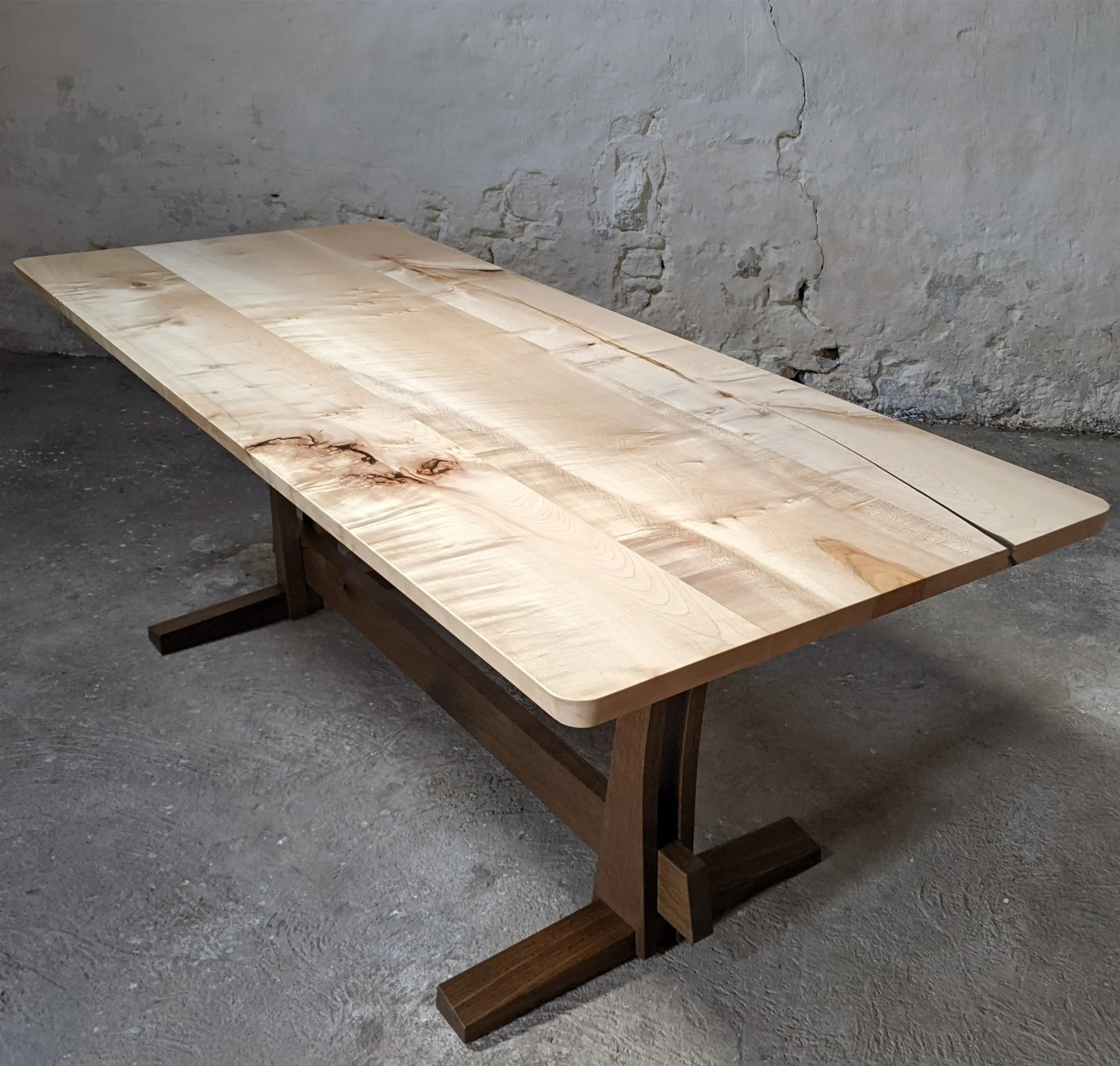 This Nakashima inspired refectory style dining table is made from sycamore and fumed oak. The central beam connects the trestle legs by means of a hidden wedge system which ensures the table remains extremely steady in use whilst being simple to disassemble if required. A traditional concept with a contemporary twist.